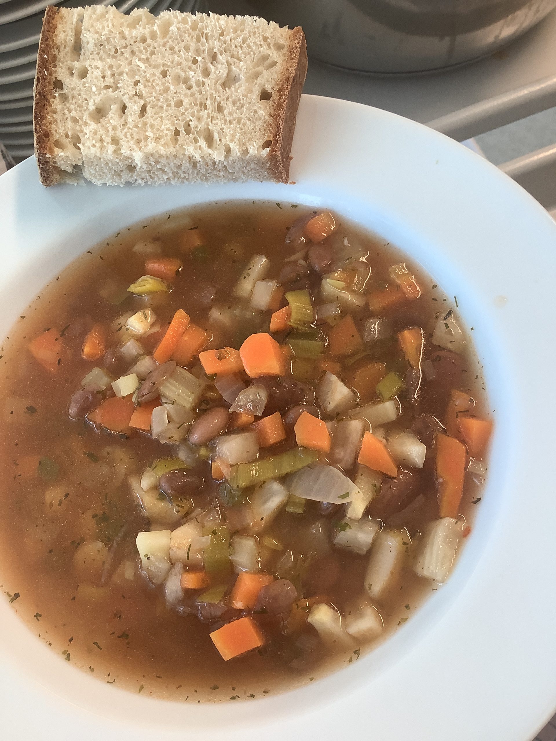 Torsdag | Hembakat bröd, pålägg, grönsak, frukt, mjölk/vatten | Enkel och matig soppa med broccoli, potatis, lök, timjan och olja. Serveras med en smörgås. | Varma smörgåsar, grönsak, frukt, mjölk/vatten |